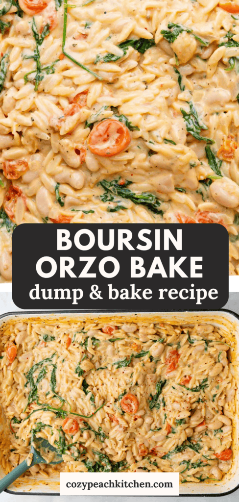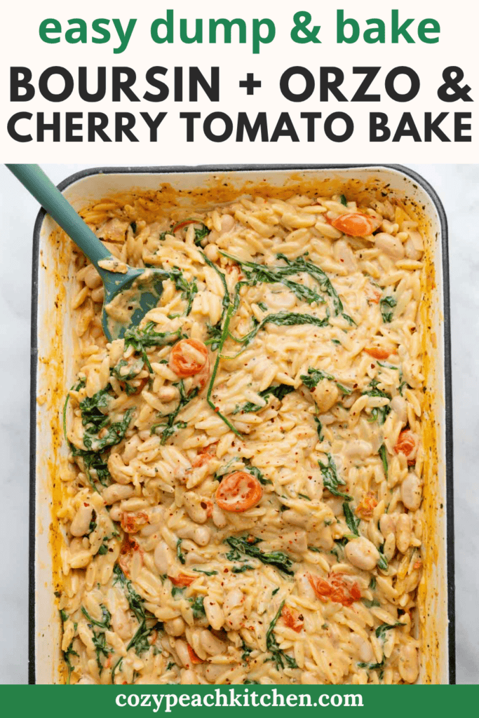 Boursin cheese bakes alongside orzo, cherry tomatoes, and cannellini beans in this simple dump & bake dinner! Ready in just over 30 minutes, this is a great recipe to make when you're craving a comforting meal but don't have much time to cook.